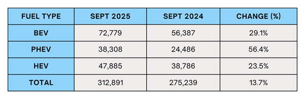 September 2025 proved to be a successful month for the UK’s electric vehicle market, led by a substantial increase in battery-electric vehicle (BEV) registrations. New SMMT data revealed a strong surge this September for BEVs, supported by parallel growth across plug-in hybrid (PHEV) and hybrid (HEV) segments. While passenger car volumes provide important context, the standout story lies within the light commercial vehicle (LCV) sector, where electric vans recorded their highest set of monthly registrations this year, signalling a significant shift in the fleet and business market. This momentum has been fuelled by greater model availability, extended government support schemes, and improved charging infrastructure. These developments mirror broader global trends, including record clean energy generation and rising consumer confidence, this is evident particularly among younger drivers which appears to be accelerating the UK’s transition to electric mobility.